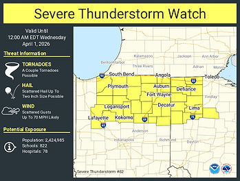 A severe thunderstorm watch has been issued for parts of Indiana and Ohio until 12 AM EDT